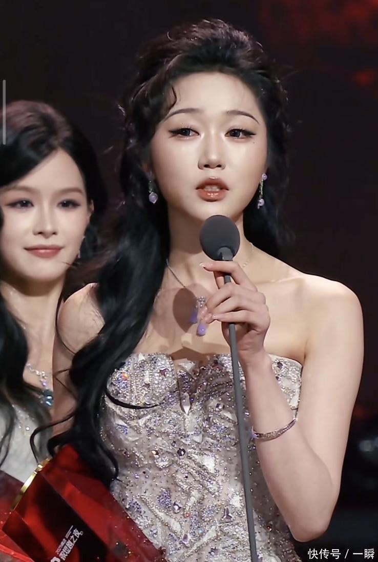 领奖的时候穿的那套,是一条抹裙开叉的长裙,身材再明显不过了。不过化的妆看着有点稍微陈旧,在横屏镜头里脸也显得有点儿宽。