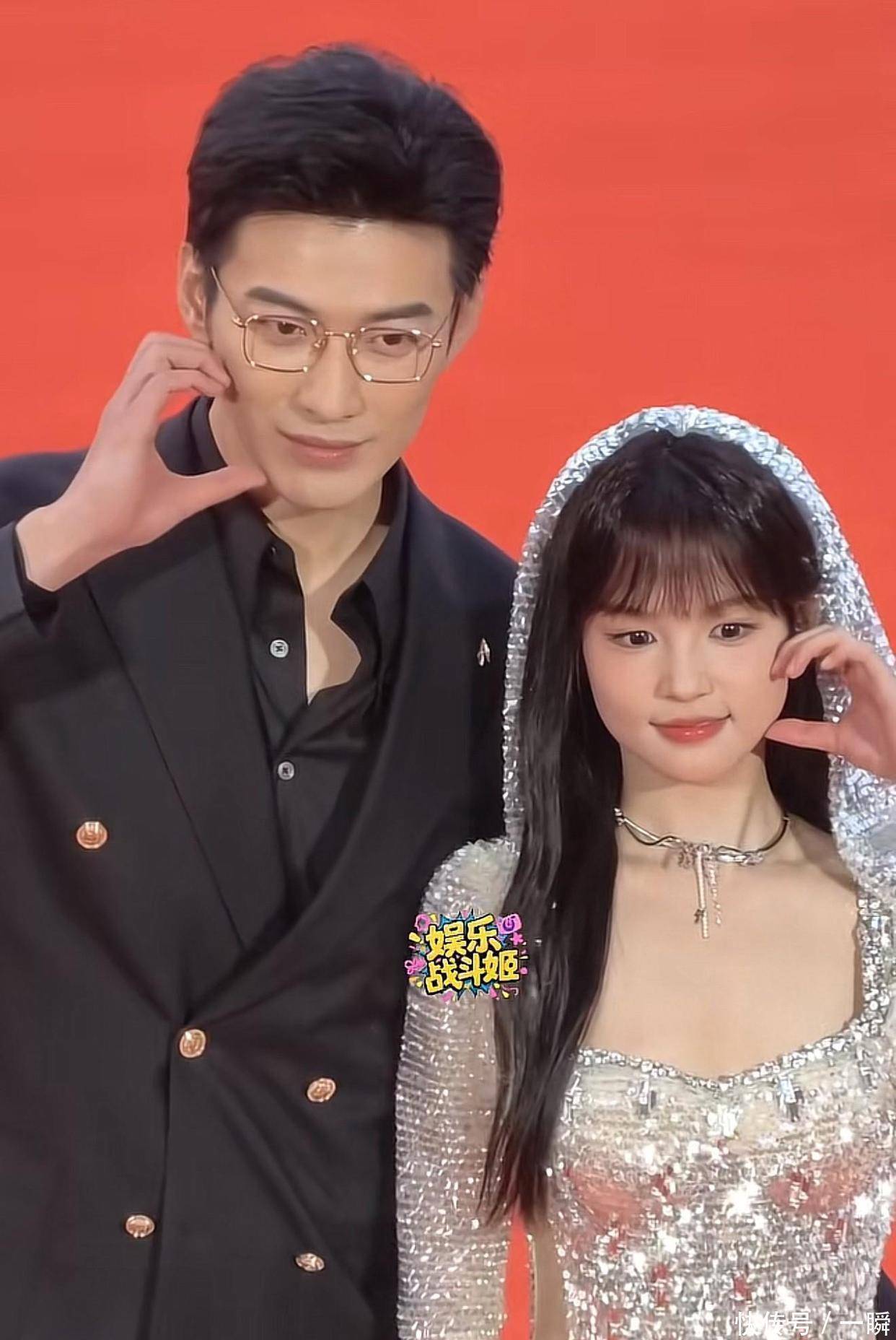 女演员们似乎心有灵犀一样,很多都戴了一顶头纱,显得特别有默契。杨咩咩穿着一身银光闪闪的礼服,头上也顶着一片同样材质的纱,整体看起来有点廉价。在现场,她和丈夫于龙甜蜜秀恩爱,无论是台上还是台下,都像是工业糖精一样甜腻腻的。