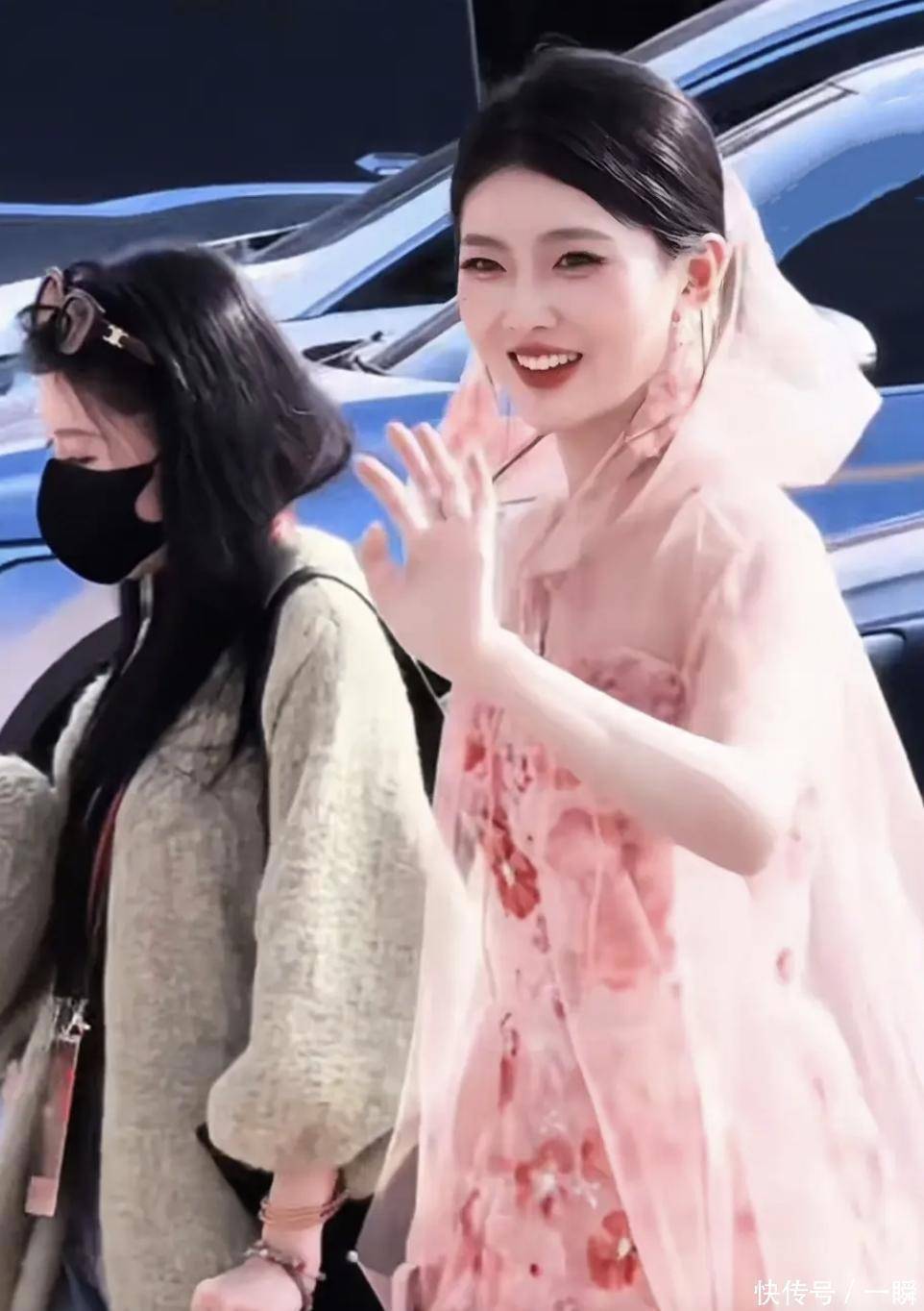 挺有意思的是,这套不算特别出彩的造型,孙芊浔还和左一撞见了。在路透照片中,孙芊浔出现时也是穿着那件粉色的礼服。